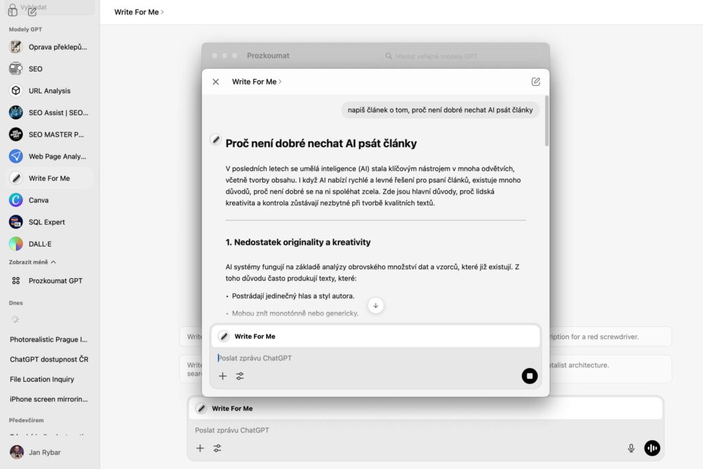 Tak jako všichni samozřejmě používám ChatGPT.com (někdy placený, nyní už pár měsíců ve free verzi, na pár dotazů denně mi stačí). Plus jsem velkým fanouškem nástroje Claude.ai, používám ho podobně jako ChatGPT, ale když potřebuji pomoct například s nějakým kódem, mám ho raději (taktéž ve free verzi).