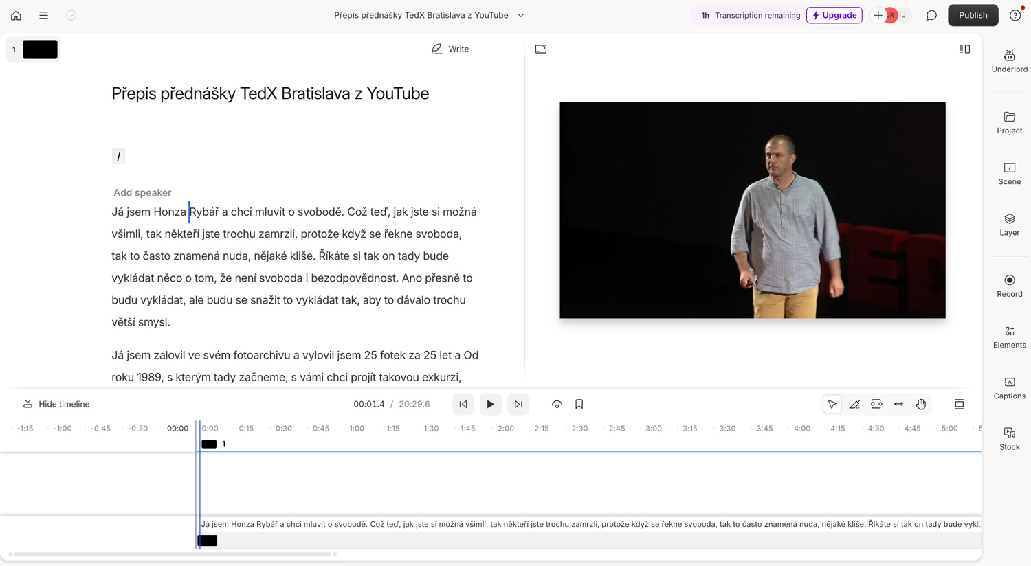 – bleskurychlý přepis videa do textové podoby – nejde jen o rozhovory, ale i třeba o obsah videa: před téměř deseti lety jsem vystupoval na TEDx v Bratislavě. A od té doby popravdě zapomněl, o čem přesně jsem mluvil. Descript vzal link na video a za pár vteřin vše přepsal do textu – jak to dokázal, to vlastně nevím, ale bylo to pozoruhodné