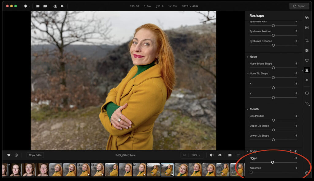 Reshape umožňuje provádět více či méně divoké úpravy, v nichž software mění tvar obličeje, očí, rtů nosu i těla. A dalších “parametrů”, u nichž se to může hodit. Opět platí, že to dopadá velmi slušně.