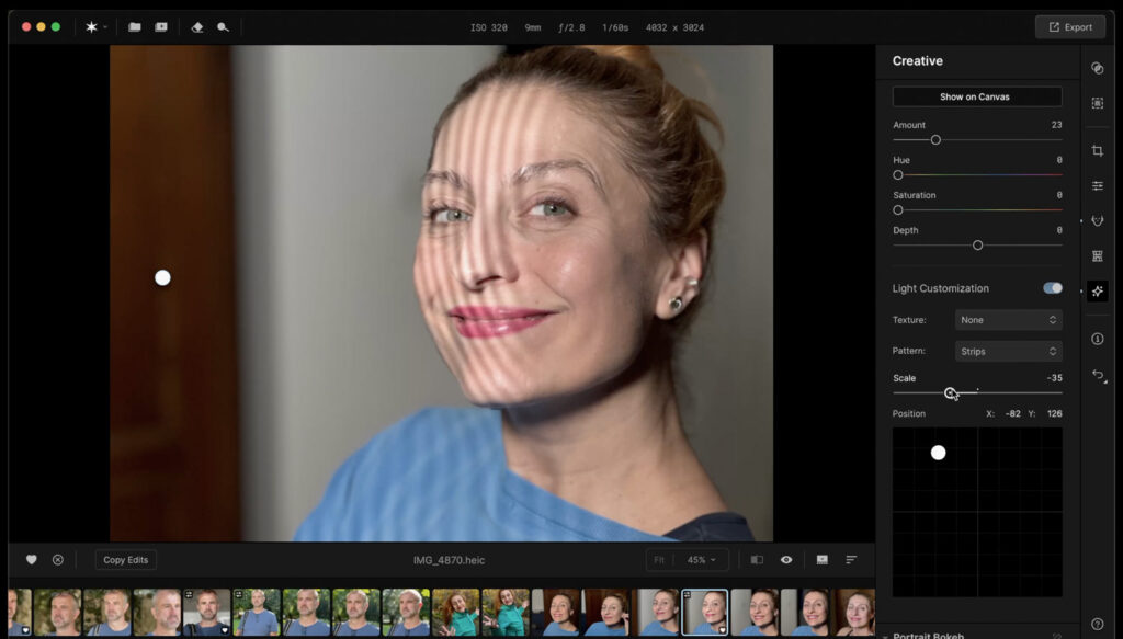 Na záložce Creative je nejzajímavější otestovat přidávání “zdrojů světla” do záběrů, kdy dokážeme do portrétu uměle (a poměrně velmi věrohodně) dodat zcela jiné typy nasvícení. Hezky to je vidět ve videu a ano, zní to trochu šíleně, já sám bych to asi nepoužíval, ale zajímavé to prostě je.