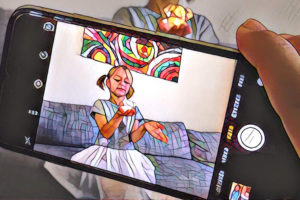 (3) Cameringo Lite: (ještě blíž k Prisma). Na první pohled efektové šílenství, rozdělené do sad podle typu efektu. Dá se na to hledět s pohrdáním, ale já si tam nacházím i všelijaké hodně zajímavé spoje do světa moderního výtvarna od nástupu na konci 19. století. Způsob vidění tvarů, barev, jejich deformování, uplatňování geometrických projekcí, (de)kompoziční finty … a dá se přemýšlet, k čemu je to nejen formálně, ale i obsahově dobré. Každý efektový filtr má svou paletku funkcí (jas, kontrast, saturace atd., plus intenzitu efektu, která někdy dělá velmi překvapivé věci). Jako post editor i fotoappka, včetně videokamery. Pozor na selfie, člověk se může sám sebe leknout víc než na Petříně v bludišti. Dále jsou tu GIFy a MaléPlanety (hlavní menu v levém horním rohu). I při zapnutém efektovém filtru si lze přes „tři tečky menu“ otevřít ještě další volby nastavení, ze kterých je možná nejužitečnější zámek AE (ikonka zámečku v pravém rohu plochy). Ale i kompas se může hodit… Prostě podle starého hesla, že i dospělí si mohou hrát.