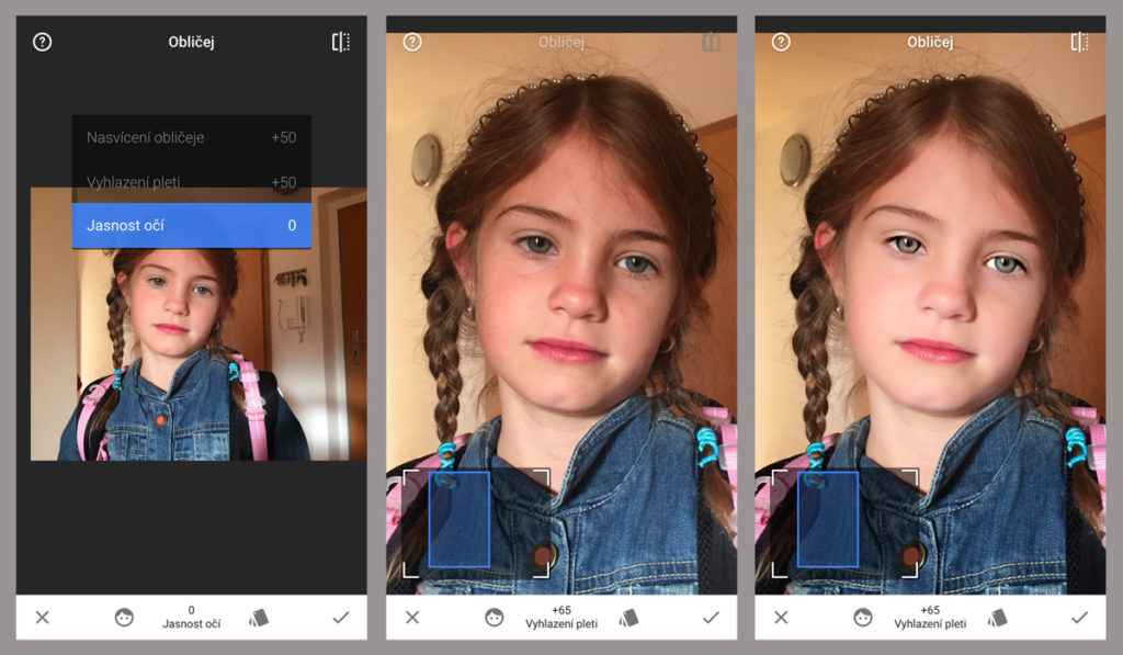 A umí, podobně jako Polarr, také překvapivě dobře upravovat obličeje. Aplikace sama dokáže najít obličej, „vyhladit ho“ a zesvětlil oči (které opět najde automaticky) a míru toho všeho samozřejmě můžete regulovat.