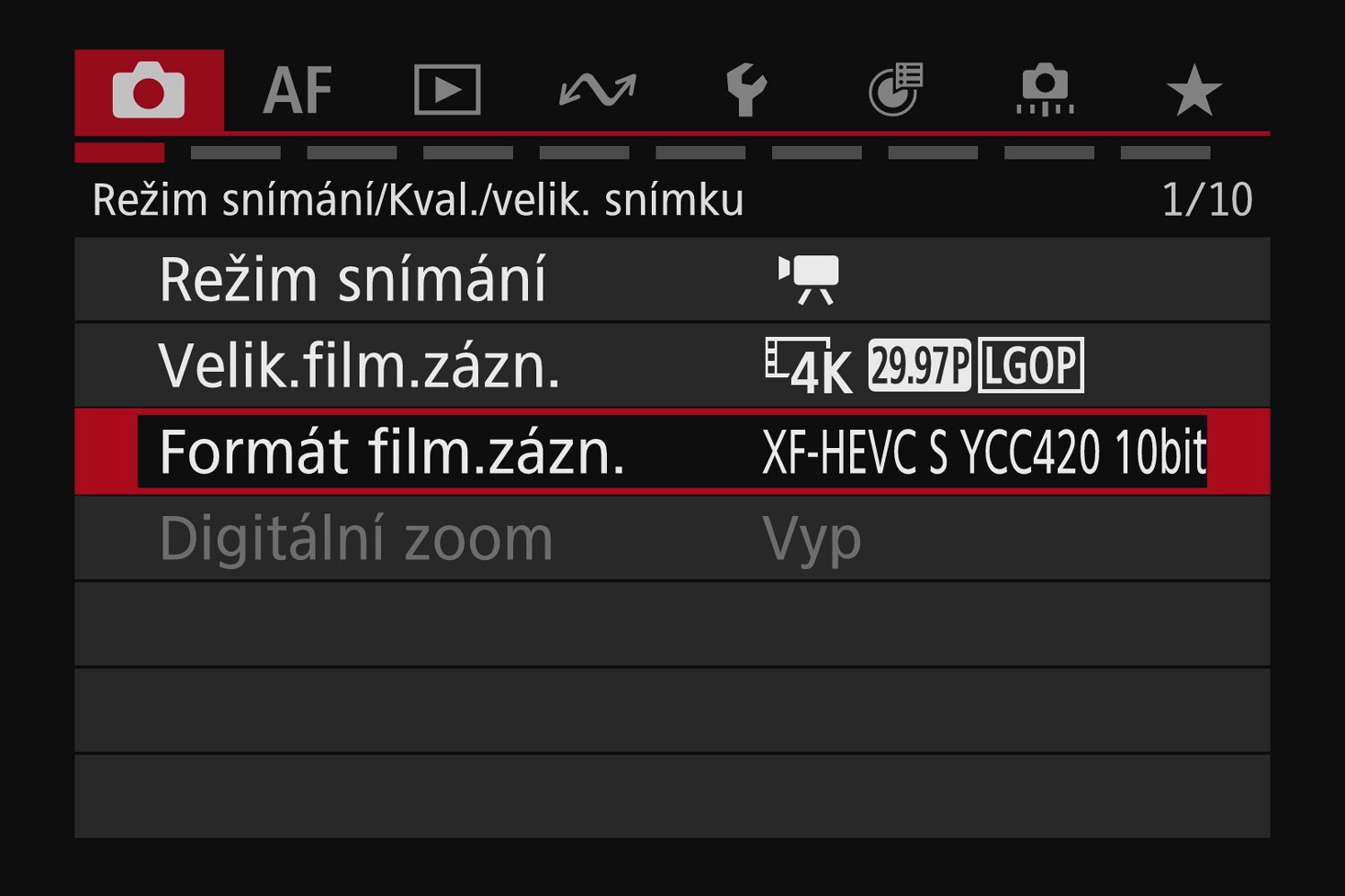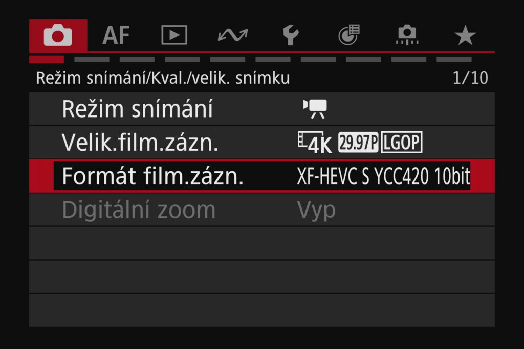 Nastavení 10 bitových formátů videa u Canonu R50 V.