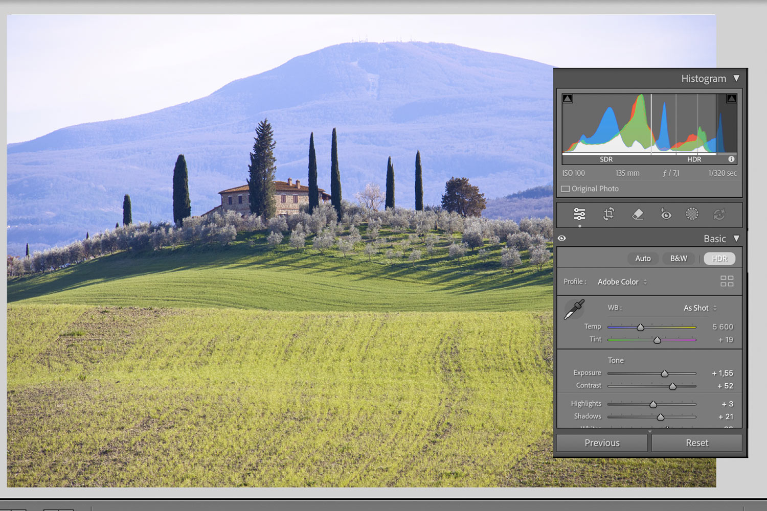 Tenhle článek má smůlu v tom, že ukázal kouzlo HDR mimo HDR zařízení, je vlastně nesmysl. Nicméně: zde je to vidět relativně dobře. Na téhle scéně z Toskánska je fotka v HDR PQ (přípona .hif) v programu Digital Photo Professional. Na mém MacBooku Pro krásně „svítí“, což na snímku obrazovky není vidět, proto je dobré vše prozkoumat v doprovodném videu.