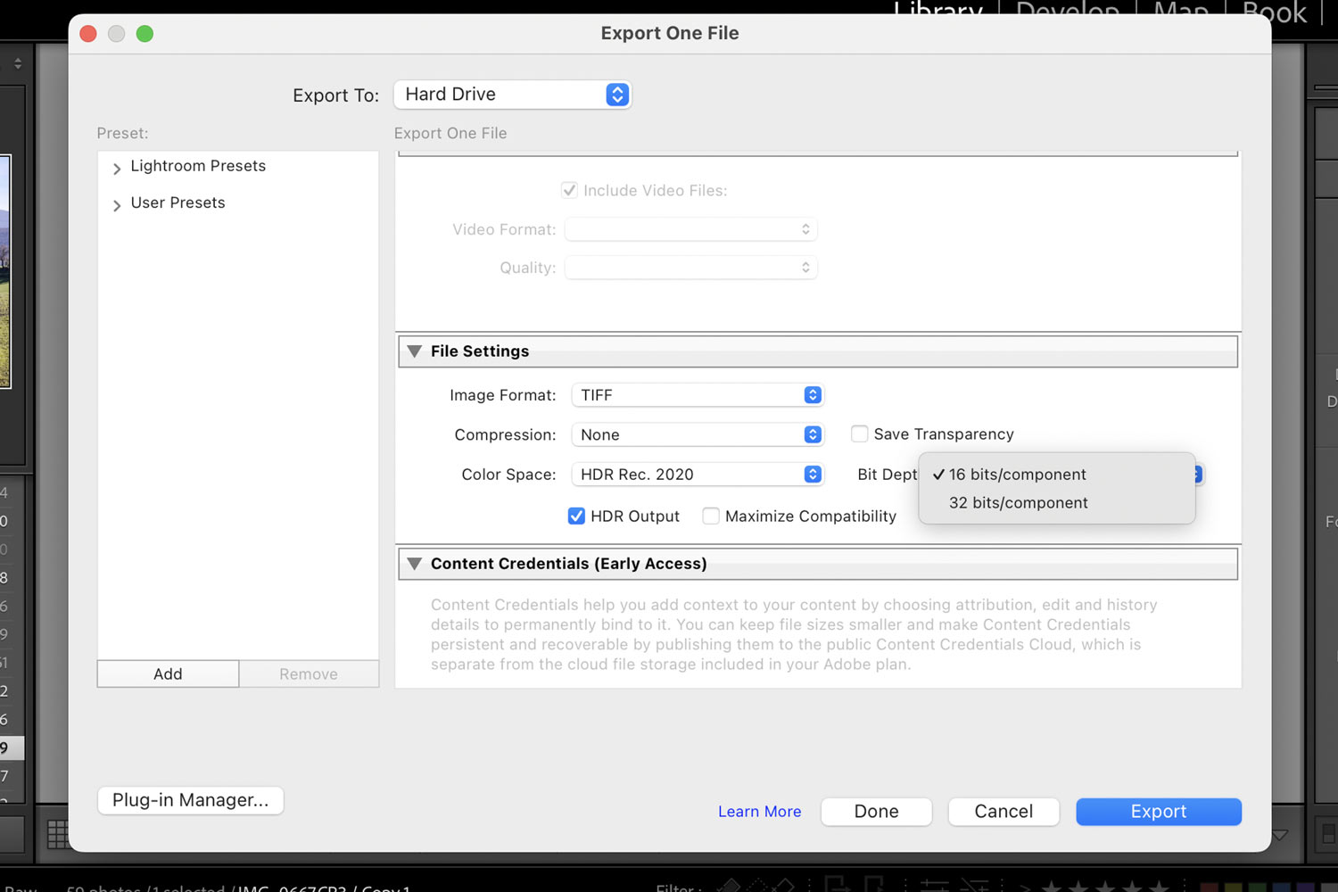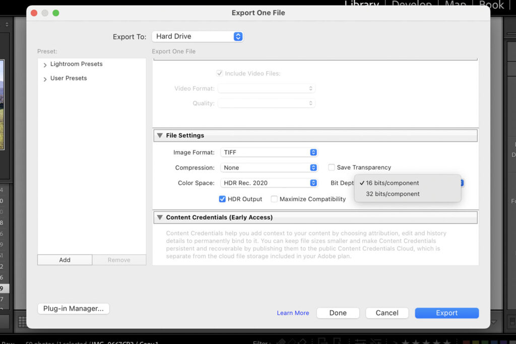 Takto jsem exportoval upravené HDR fotky z Lightroomu – tiff a 16 bitů.