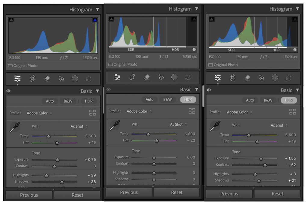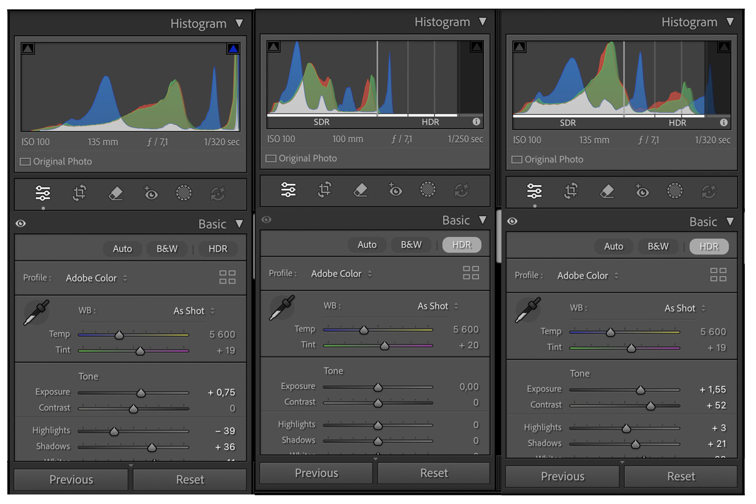Tři histogramy z Lightroomu to vše hezky ukazují: nalevo je normální. Pak přidáme „políčko“ pro HDR. A na třetím je pak už práce s širším dynamickým rozsahem.