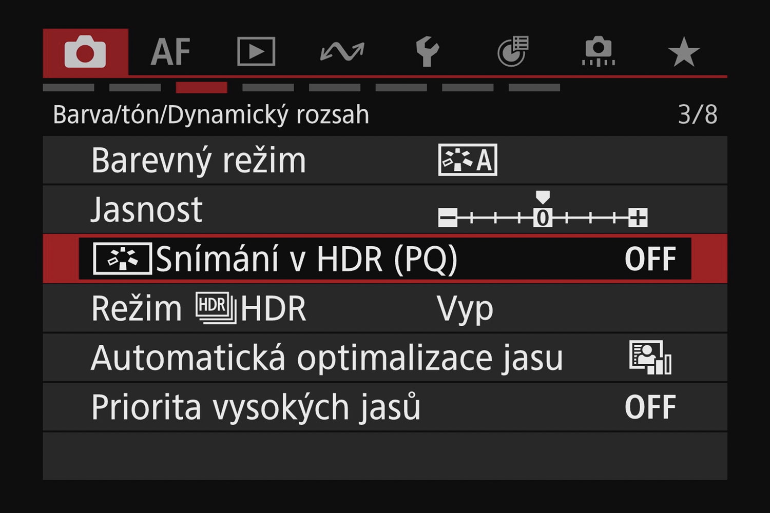 Pokud si chcete začít hrát s HDR u Canonů, je třeba nastavit focení do formátu HDR PQ, viz ilustrace (je k dispozici na všech modelech, s výjimkou, pokud se nepletu, nejlevnějšího Canonu R100).