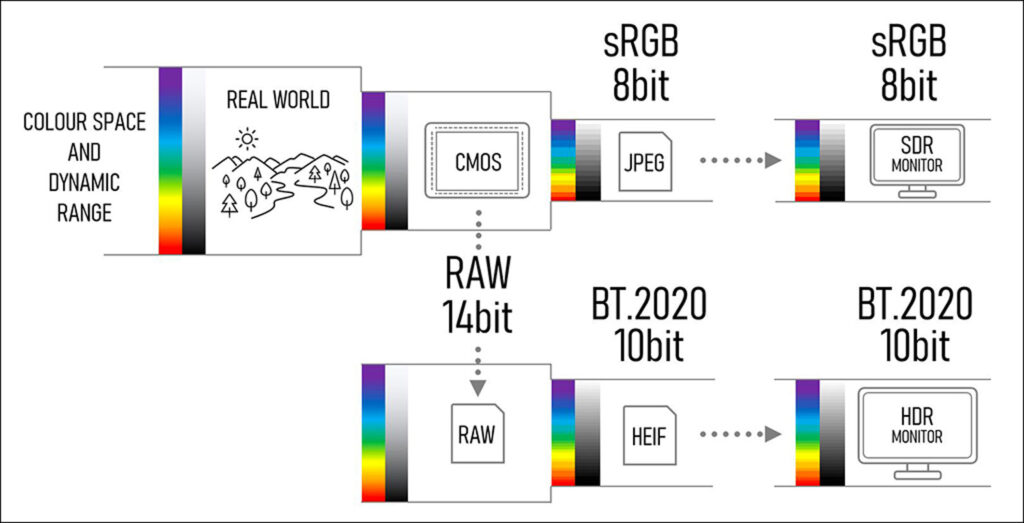 – druhý pilíř: záznam v HDR PQ je ukládán ve formátu HEIF, což samo o sobě znamená zásadní revoluci a mnohem kvalitnější záznam (nejen dynamického rozsahu, viz dále)