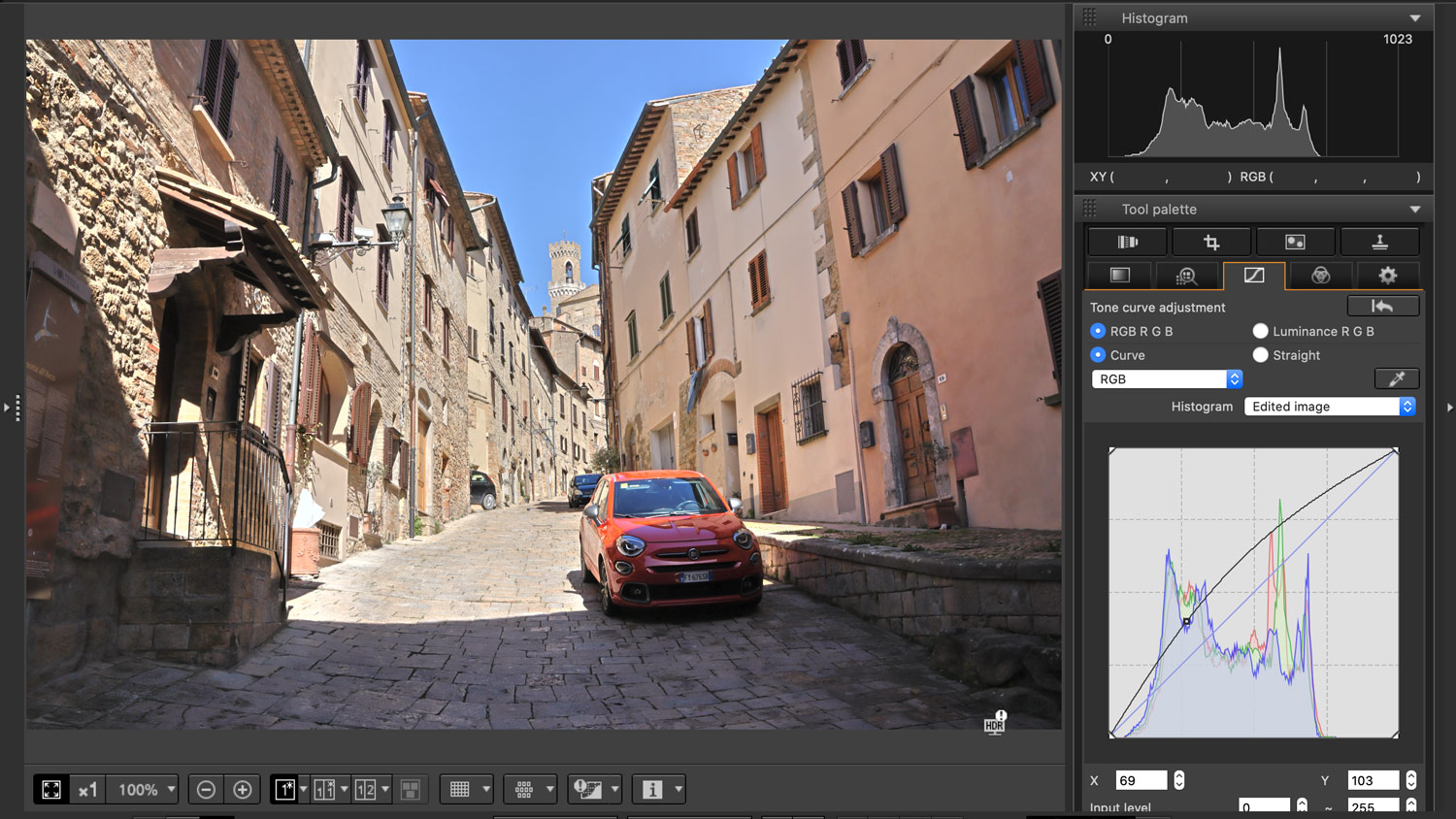 – najeďte na konkrétní fotku a v levém horním rohu zmáčkněte Edit image – tím fotku otevřete pro určitý typ úprav – já si hrál hlavně s křivkami v “Tone curve adjustment” v panelu nástrojů napravo