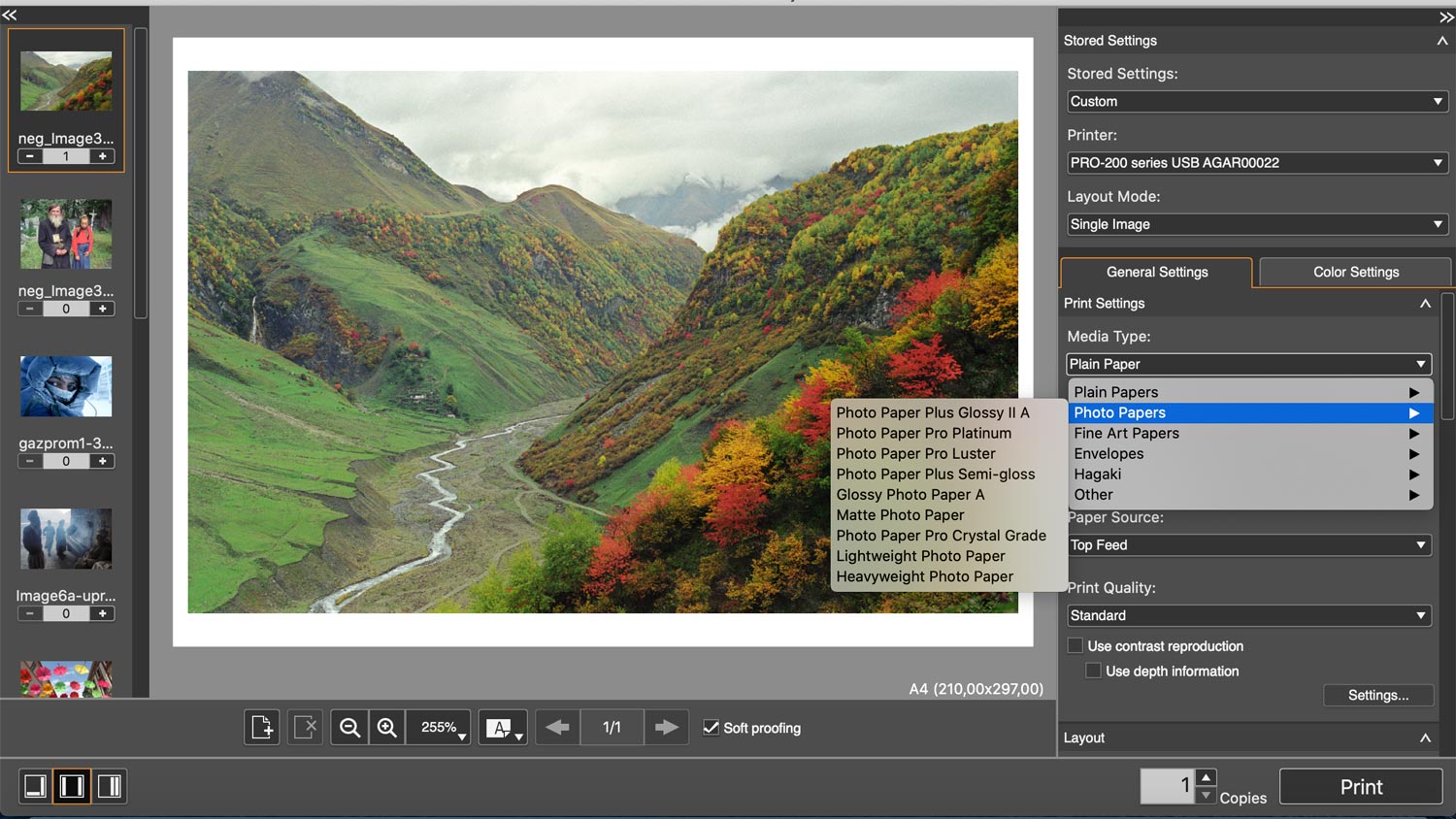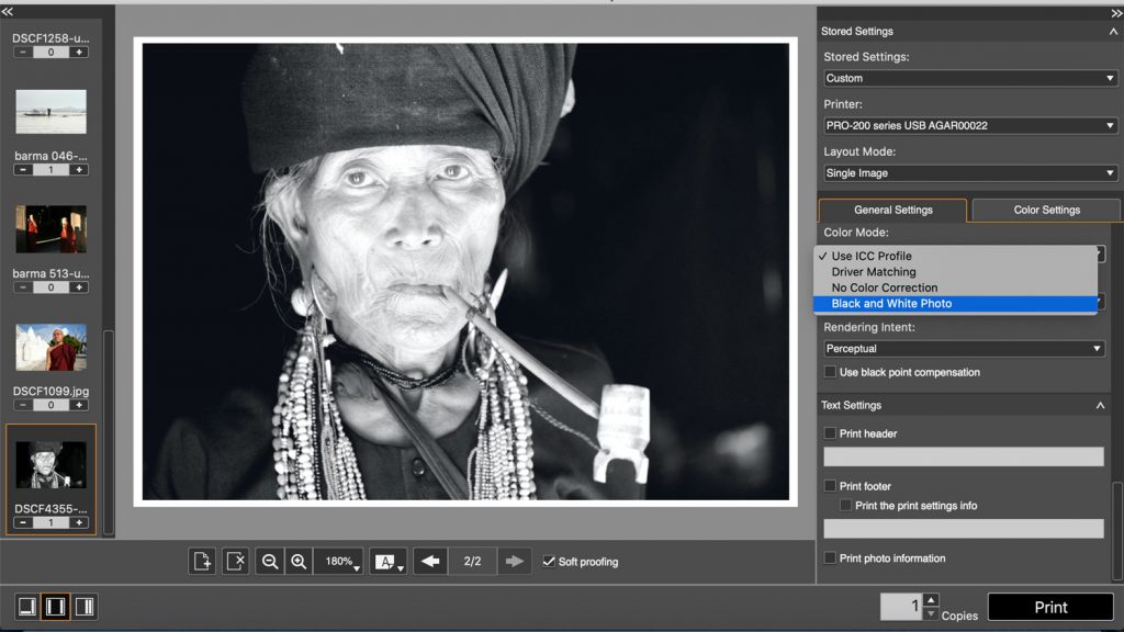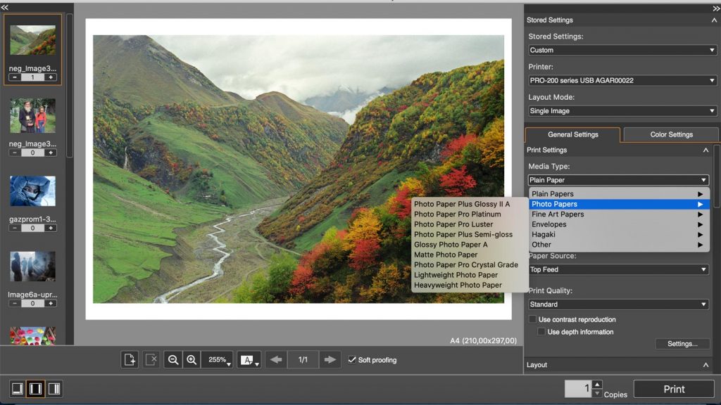Jak už jsem zmínil, právě možnost používat pro tisk speciální program Professional Print and Layout Software považuji za zásadní výhodu. Nabízí totiž velmi přehledné nastavení, které trpělivým i uspěchaným fotografům dá bezpočet možností, jak ze stroje vytáhnout co nejlepší výsledky…