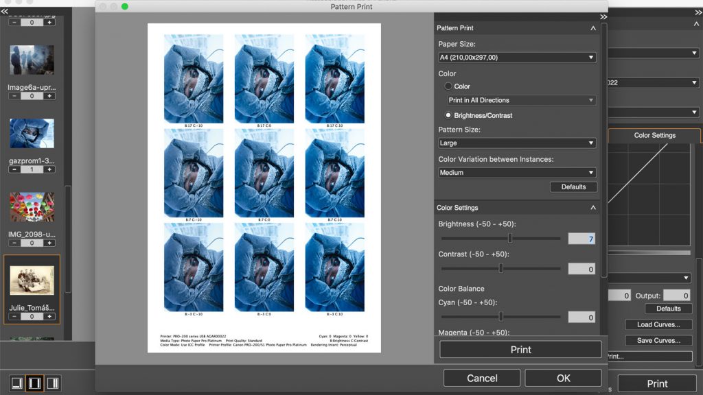 Výborná funkce je Pattern Print, který dovolí na pár kliků vygenerovat a pak na jeden list zvoleného fotopapíru vytisknout několik verzí fotky s různými nastaveními. Podle těchto náhledů je pak možné zjistit, která z verzí se nejvíce blíží našim představám (nebo tomu, co vidíme na displeji) – u každého vytisknutého náhledu je napsaná míra barevného/jasového posunu, a proto lze docílit finálního vytisknutí přesně té verze, která se nám líbí nejvíc. Jiným slovy: je to tak trochu cesta, jak vše vyladit metodou pokusů a omylů. Funguje to lépe, než to může znít na první poslech.