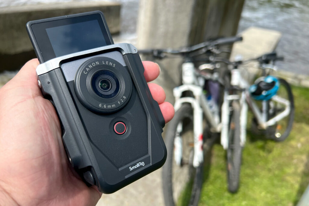 Opravdu malé rozměry: čekal jsem, že to bude malá hračka, ale její reálná velikost mě i tak překvapila. Canon V10 je opravdu malý a vleze se pohodlně do jakékoliv kapsy. Rozměry jsou 63,4 × 90,0 × 34,3 mm, váha jen 211 g. Kamera se bude, pokud tomu dobře rozumím, prodávat včetně krytu/chrániče/držáku firmy SmallRig (viz fotky i video). Kryt jednak poskytuje určitou mechanickou ochranu, druhak dává možnost ještě snadnějšího připevnění například na stativy. Rozměry pak budou trochu větší, ale i tak stále malé.