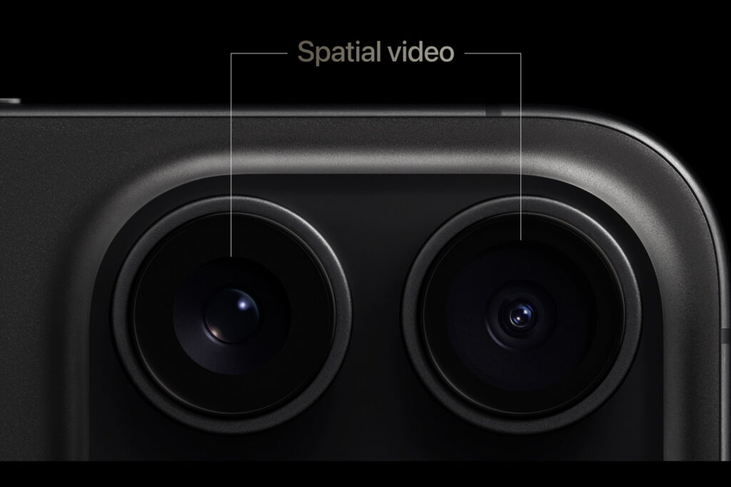 A jak to funguje? Jako normální (trochu zazoomované) video, které je nutné točit na šířku. Protože, viz ilustrace, iPhone zde kombinuje záznam z foťáku hlavního s daty z ultraširokoúhlého snímače/objektivu. Při pouštění záznamu se prostorové video chová jako video normální. Ale má v sobě “zakódovanou” prostorovost, kterou je pak možné zobrazit v brýlích.