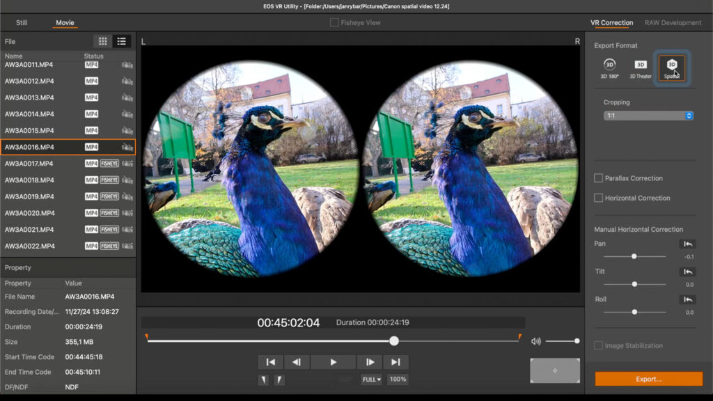 1. nástroj EOS VR Utility, tedy nástroj Canonu pro práci s duálními videi, od podzimu nabízí možnost exportu do prostorového videa (je zadarmo, ale s určitými limity – video například nemůže být delší než dvě minuty)