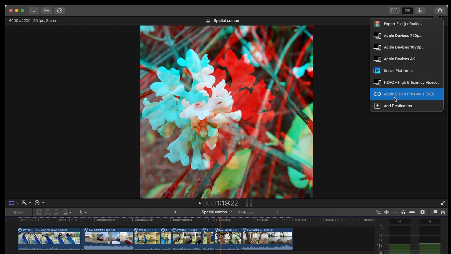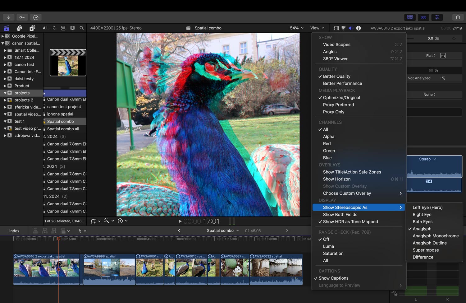 2. nástroj: Final Cut Pro nyní umí s těmito exporty pracovat – tento (placený) software bývá často na Macu volbou tvůrců obsahu, kteří potřebují stříhat video (patřím k nim mnoho let i já). Na podzim přišla velká aktualizace, která umožňuje pokročilý střih prostorového videa. A v popisu novinky je právě zmíněn i Canon R7 s tímto objektivem jako jediná možnost, jak záznam pořizovat mimo zařízení Apple. (Žádný jiný duální objektiv od Canonu to zatím neumí).