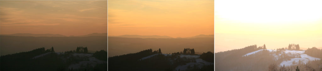 Ty samé možnosti nám dává fotoaparát při focení onoho západu slunce – podívejte se na tři zdrojové snímky (vypadají přesně tak, jak „vypadly“ z fotoparátu. Když je na nich nebe, les je jen černou plochou, pokud nastavíme expozici foťáku tak, aby byl vidět les, zesvětlit musíme pochopitelně celý obrázek – a nebe nám úplně, nebo alespoň částečně zmizí.