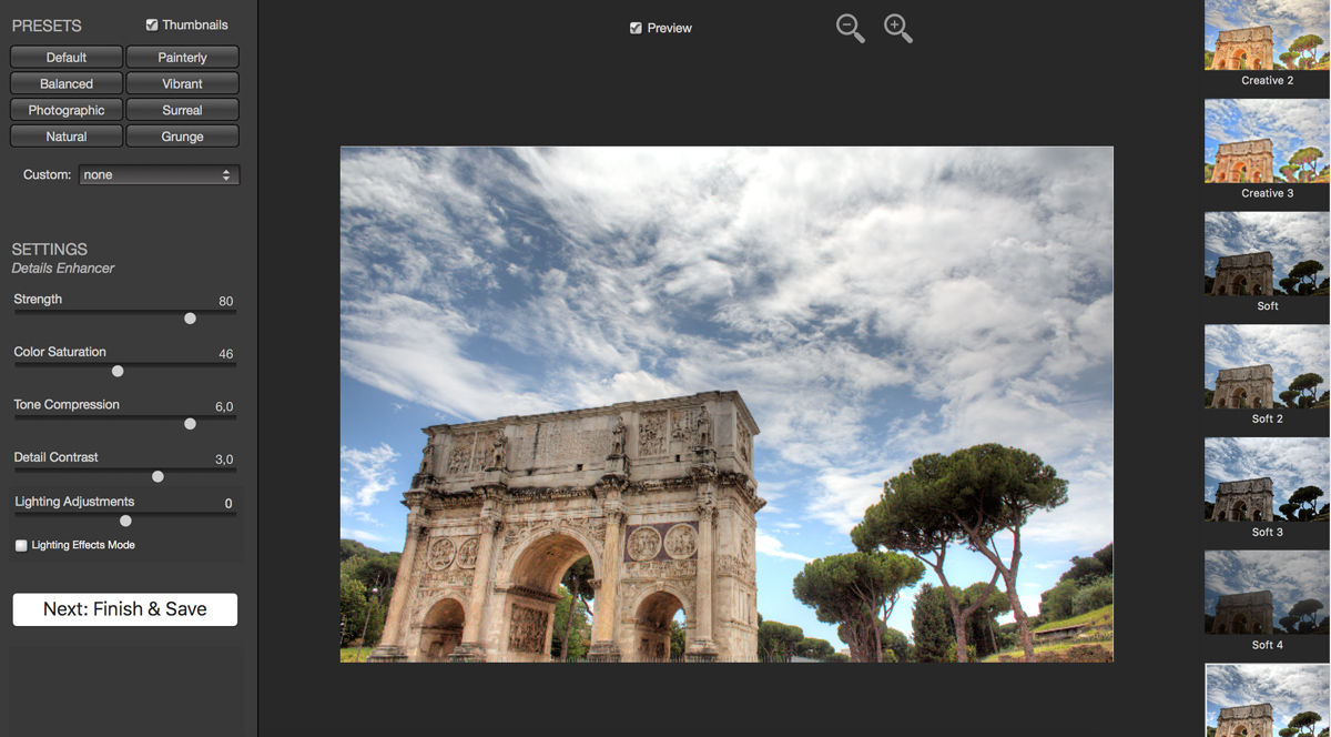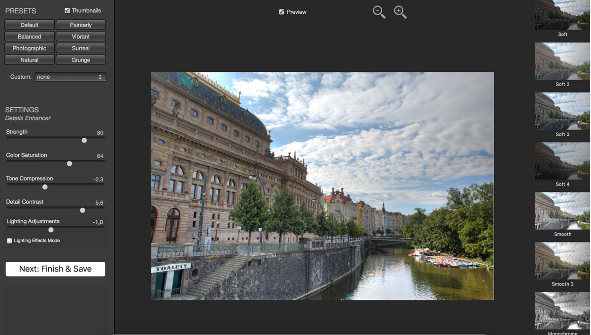 – Hrajte si s přednastavenými možnostmi v pravém sloupci. Tohle je právě nejsilnější zbraň Photomatixu, začátečníkům nabídne v pravém sloupečku mnoho skvělých i divokých variant, jak by mohl výsledný obrázek vypadat.