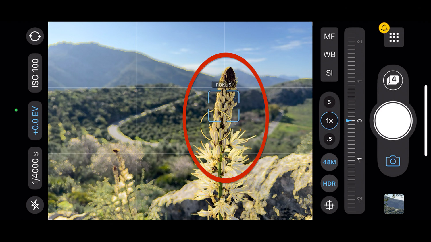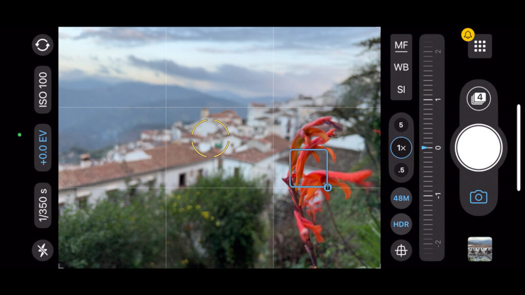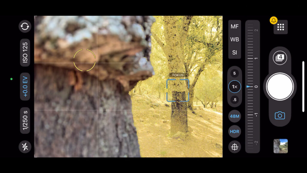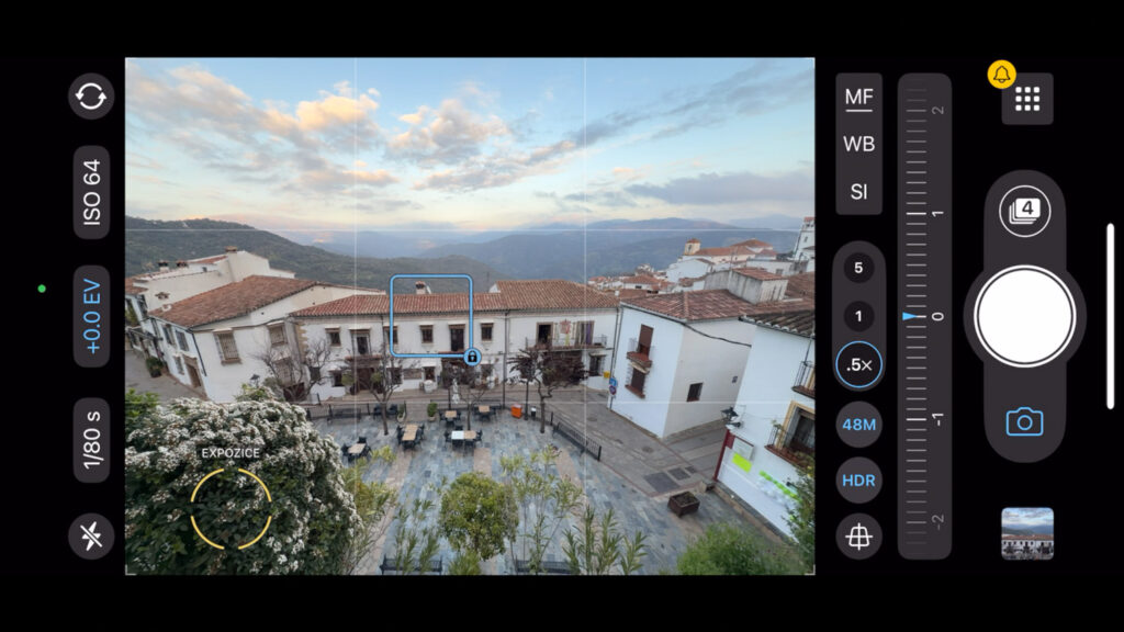 Jednou z několika zásadních funkcí ProCamery, kterou osobně považuji za návykové, je elegantní možnost ovládat ostření a expozici. Pokud se lehce dotknete displeje, objeví se dvojice obrazců: modrý čtvereček Focus a žluté kolečko Expozice.