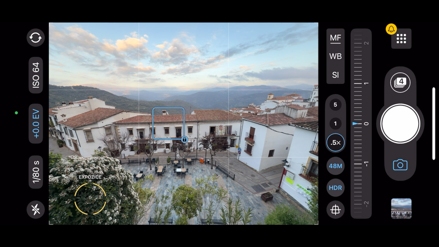 Expozice pomáhá s přesným nastavením, jak je výsledná fotka světlá nebo tmavá. Podle toho, kam ukážeme, tedy dokážeme velmi rychle vše vyladit – a to bez rizika, že po pár fotkách se vše zresetuje (jako u defaultní aplikace iPhonu).