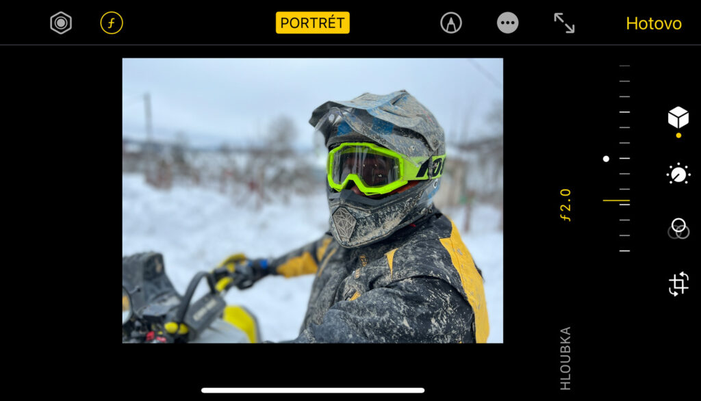 Jak: Portrétní mód jde vypnout (viz výše). Jde ale měnit i stupeň rozmazanosti – přes defaultní editor a knoflík “f” v levém horním rohu – dole se objeví šoupátko, které to zařídí.
