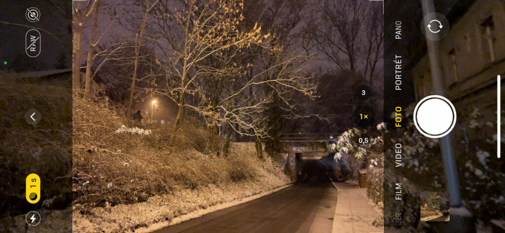 Noční režim na iPhonu není třeba nijak zapínat – pustí se sám, když je málo světla (poznáme to podle toho, že v levém rohu začne svítit žlutá „tečka“ s časovým údajem. Pak iPhone snímá až několik vteřin a z pořízených dat vytvoří fotku. Dobré je tedy se nehýbat.