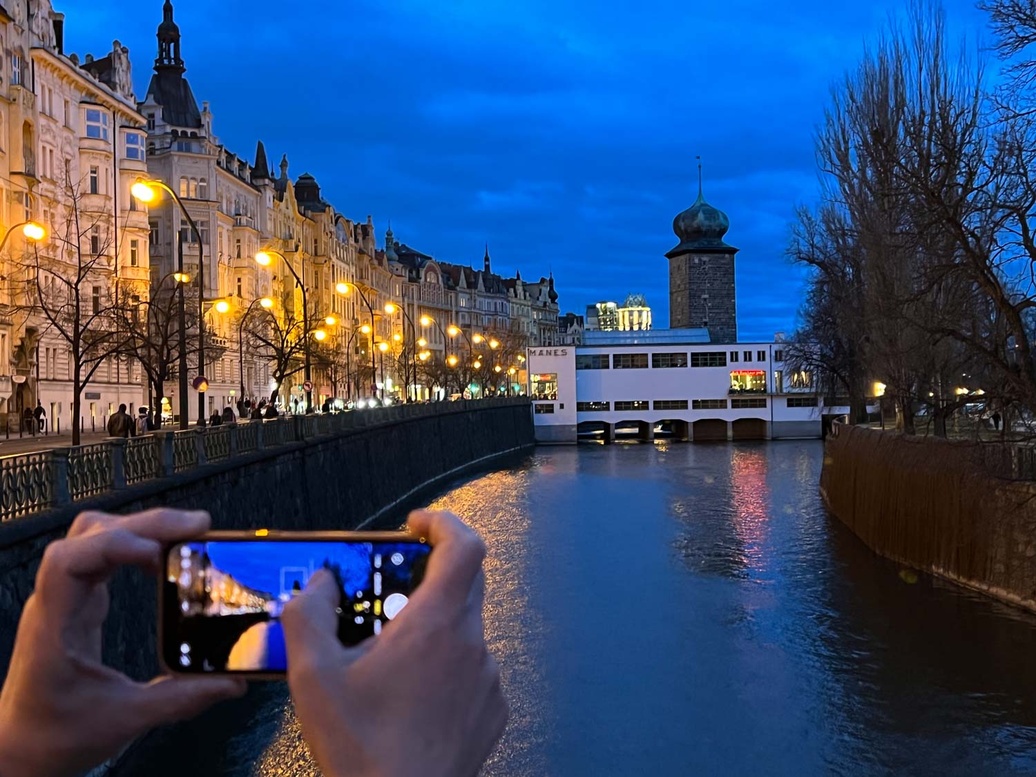 Jak: Hrajte si. Ideálně v “modré hodince” a zkoušejte různá nastavení nočního režimu: spustí se sám ve tmě (žlutý “knoflík s časovým údajem), čas expozice lze měnit a s ním i podobu fotky (obvykle není nutné).
