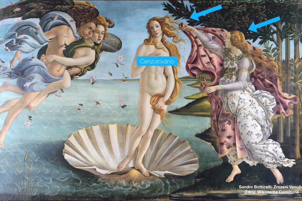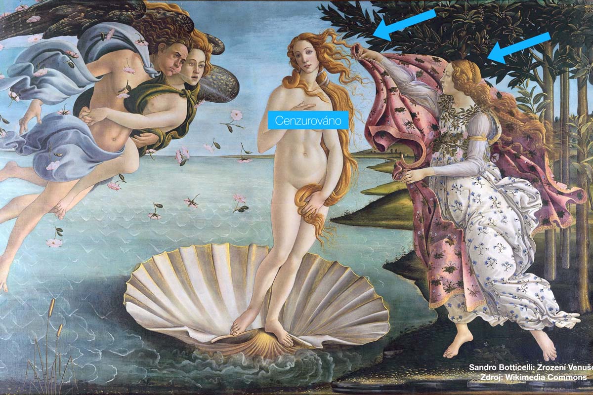 Ty nenápadné listy v pravém horním rohu (stejně jako křídla v rohu levém) jsou zásadní a fungují zcela stejně jako stín na fotce u psa z tenisu nebo pod mostem (viz výše): odrážejí pozornost a rámují obraz. Sandro Botticelli: Zrození Venuše