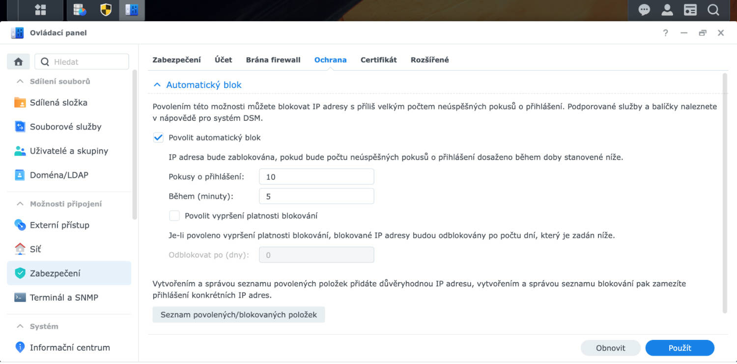 Jak jsem zmínil, řešení zabezpečení nemůžeme nechat jen na NASu… Stejně jako nenecháváme v kavárně otevřený počítač. Když bych to vůbec nechtěl nebo nedokázal řešit, tak bych se alespoň snažil řešit zabezpečení na NASu. A i tam jsou určité možnosti, jak to udělat přímo na něm. To všechno je na ovládacím panelu Zabezpečení – tam jsem schopný ovlivnit přístup do zařízení, mohu například nastavit, že jen z ČR se mi někdo může dostat do zařízení. Pak jsou další prvky, jeden bych vypíchl, a tím je automatická blokace na základě IP adresy. To se často používá třeba u firemních sítí – když se někdo snaží dostat do zařízení, mohu si nastavit určitý limit, kolik pokusů mu dám, než ho zablokuji. Všechno toto je podrobně popsáno v naší nápovědě.