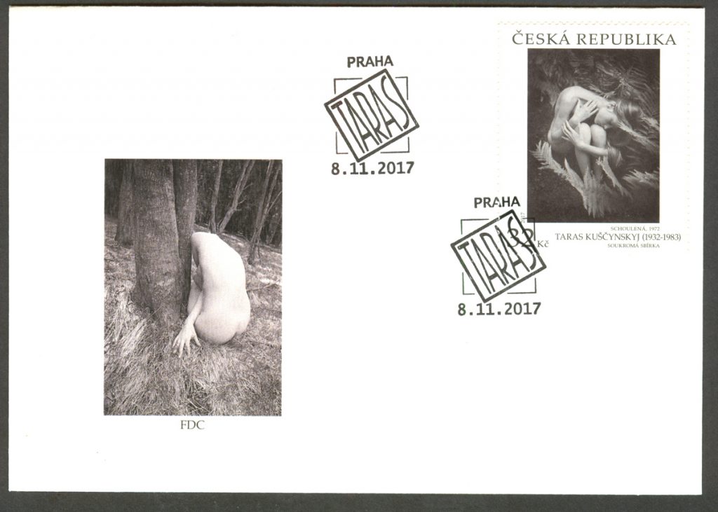 Obálka se známkou zobrazující fotografii Tarase Kuščynského Schoulená. Zdroj skenu: Česká pošta