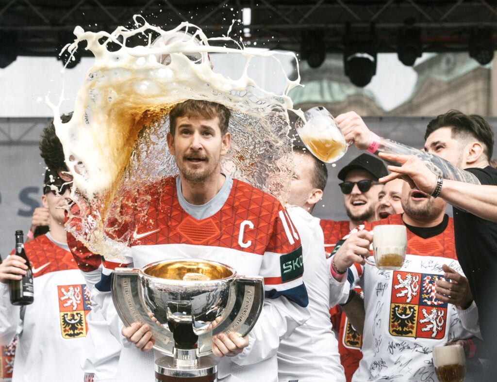 Oslavy titulu mistrů světa v hokeji 2024 na Staroměstském náměstí v Praze… Spoluhráči právě polévají kapitána Romana Červenku pivem… Foto: Michal Růžička – publikováno s jeho svolením.