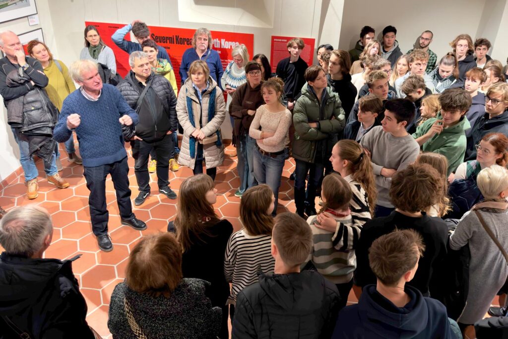 Jan Šibík na výstavě Severní Korea při komentované prohlídce. Rychlofotka mobilem: Fotoguru.cz