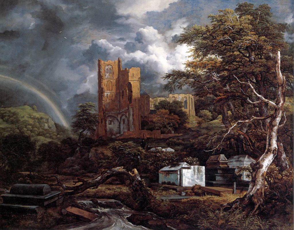 Zřícenina hradu se starými náhrobky a polámanými stromy vypráví o pomíjivosti světa. Větrný mlýn čelí těžkým mračnům. To jsou hlavní postavy Ruysdaelových obrazů. Malíř také miloval nejrůznější atmosférické jevy a hodně je ve svých obrazech zachycoval, protože mu pomáhaly dodat scéně atmosféru a příběh.