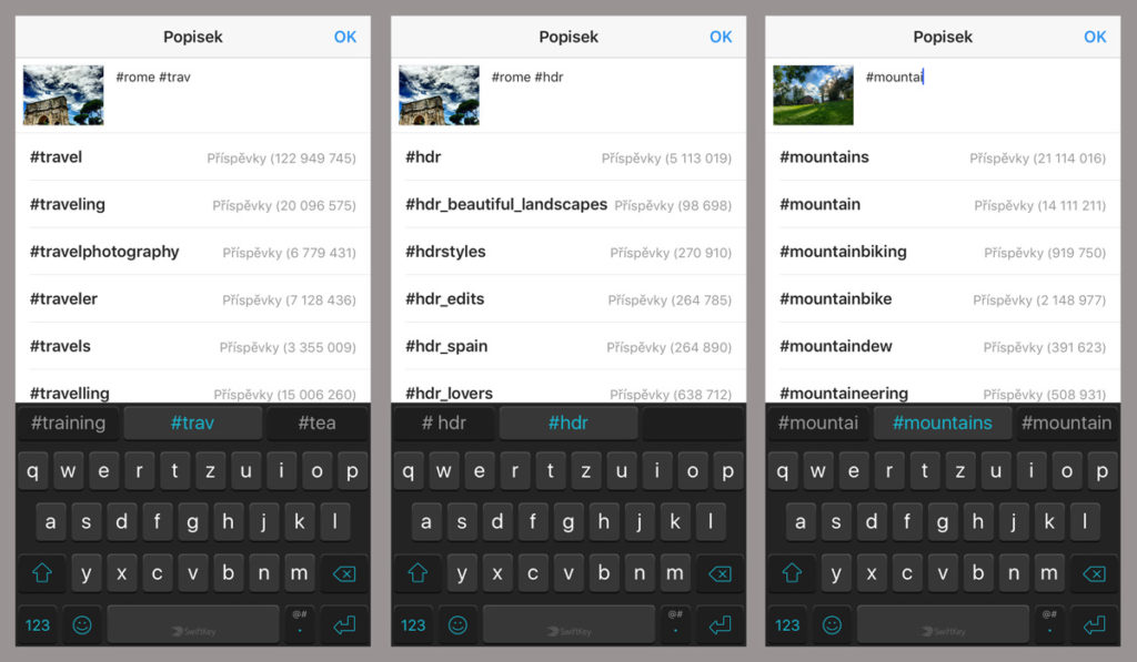– sama aplikace v procesu psaní popisků začne napovídat, jaké tagy by se mohly hodit, viz ilustrace, napovídátko napoví a ukáže čísla o užívání. Je třeba brát vše s rezervou, jednu dobu jsem pořád zkoumal, zda je lepší napsat #czech republic nebo #czechrepublic, a pak pochopil, že takto do detailu to nemá smysl zkoumat a je lepší se třeba opalovat na Žofíně.