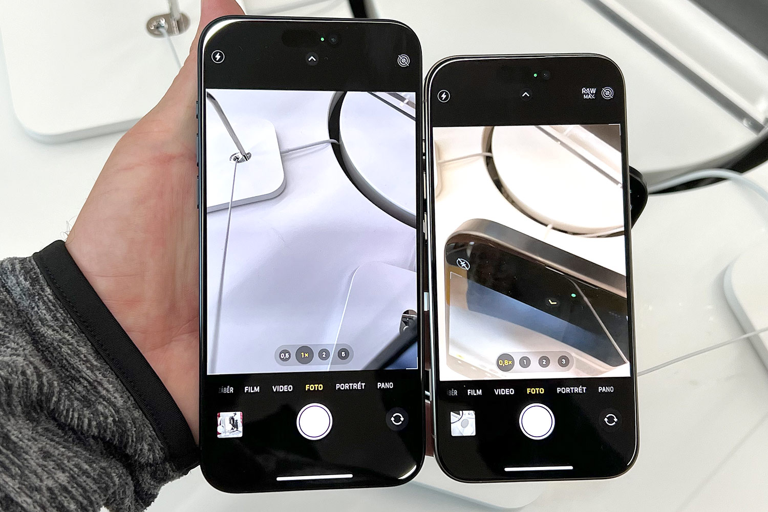 iPhone 15 Pro Max (nalevo) versus Iphone 15 Pro. I z displeje je patrné, že u Pro Max je k dispozici jen 1x a 2x přiblížení, které „obstará“ základní snímač (24 mm). Pětinásobný zoom je jen a pouze pětinásobný. Tedy neumí klíčové trojnásobné portrétní přiblížení. Proto je pro fotografování lidí rozumnější zůstat u „obyčejného“ Pro.
