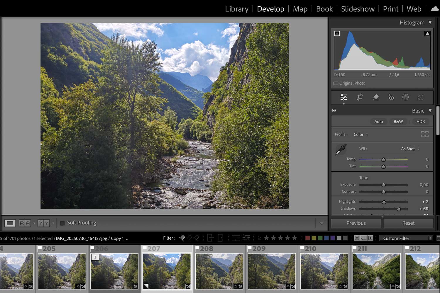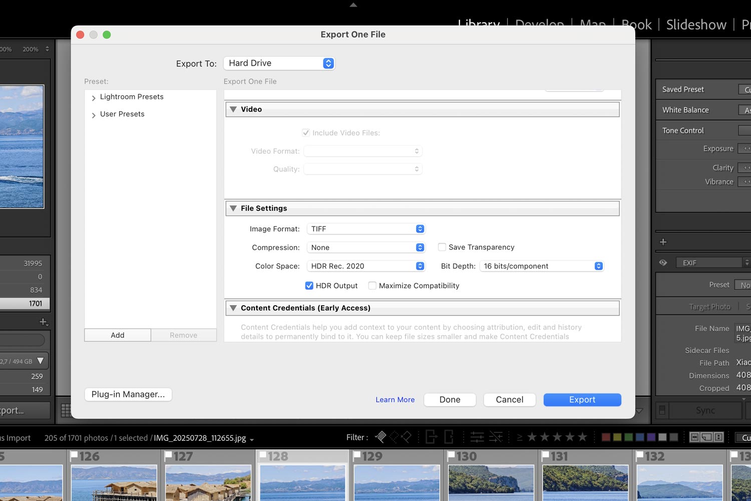 Klíčový nástroj: Lightroom. Pokud si chcete začít hrát, mých pár týdnů experimentů se dá shrnout do jediné věty. Bez Lightroomu na desktopu se z místa nepohnete. Tam je potřeba nejprve v editoru aktivovat zobrazení HDR a potom vše vyexportovat ve formátu, který bude video editor schopen “přečíst”. A jediné, co mi fungovalo, byl export do formátu TIFF, který byl schopen HDR informace udržet – slibně vypadá též další formát zvaný AVIF, kde se mi ale párkrát něco pokazilo, tedy TIFF uložený v 16 (nikoliv 32) bitech byla jediná 100% cesta.