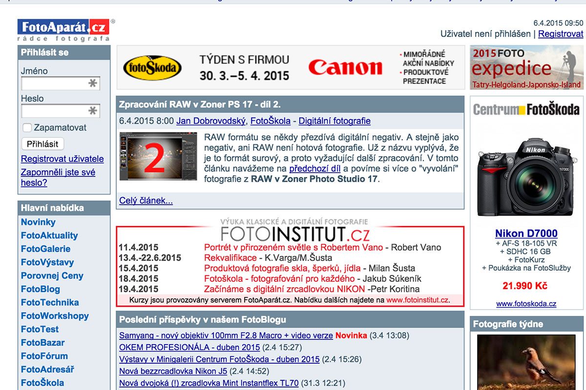 Jeden z nejstarších a největších webů o fotografování v ČR, mnoho podrobných článků, mnoho informací.