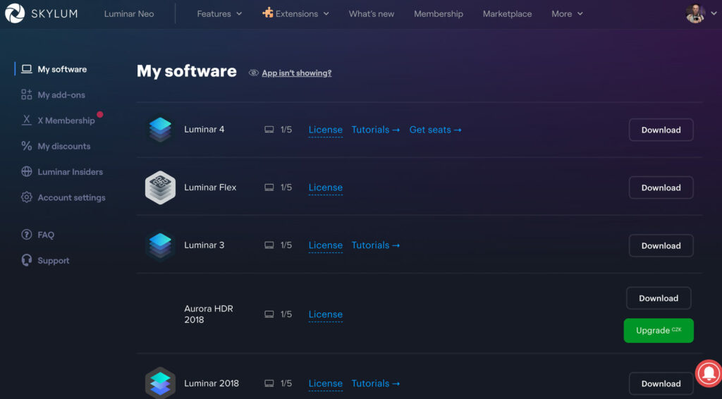 Extras / Extensions (Doplňky) jsou čtvrtou důležitou sekcí, které stojí trochu bokem. Jak název napovídá, Luminar Neo nabízí i některé speciální doplňky, které se mohou hodit pro důležité, ale přece jen specifické funkce. Pro potřeby tohoto článku jsem je nezkoumal, ale časem se k nim vrátím – osobně mě třeba láká vyzkoušet rozšíření Upscale, které by mělo umět vzít malou nekvalitní fotku a “dopočítat” jit do podoby, kde vynikne více detailů a půjde třeba vytisknout. Podobně zajímavě zní Background Removal, tedy nástroj pro odstranění pozadí – uvidíme, vyzkouším.