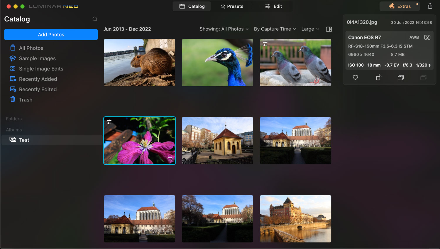 Luminar Neo má tři základní sekce – Katalog, Presety a Editor. Názvy samozřejmě vcelku jasně ukazují, co se kde děje…