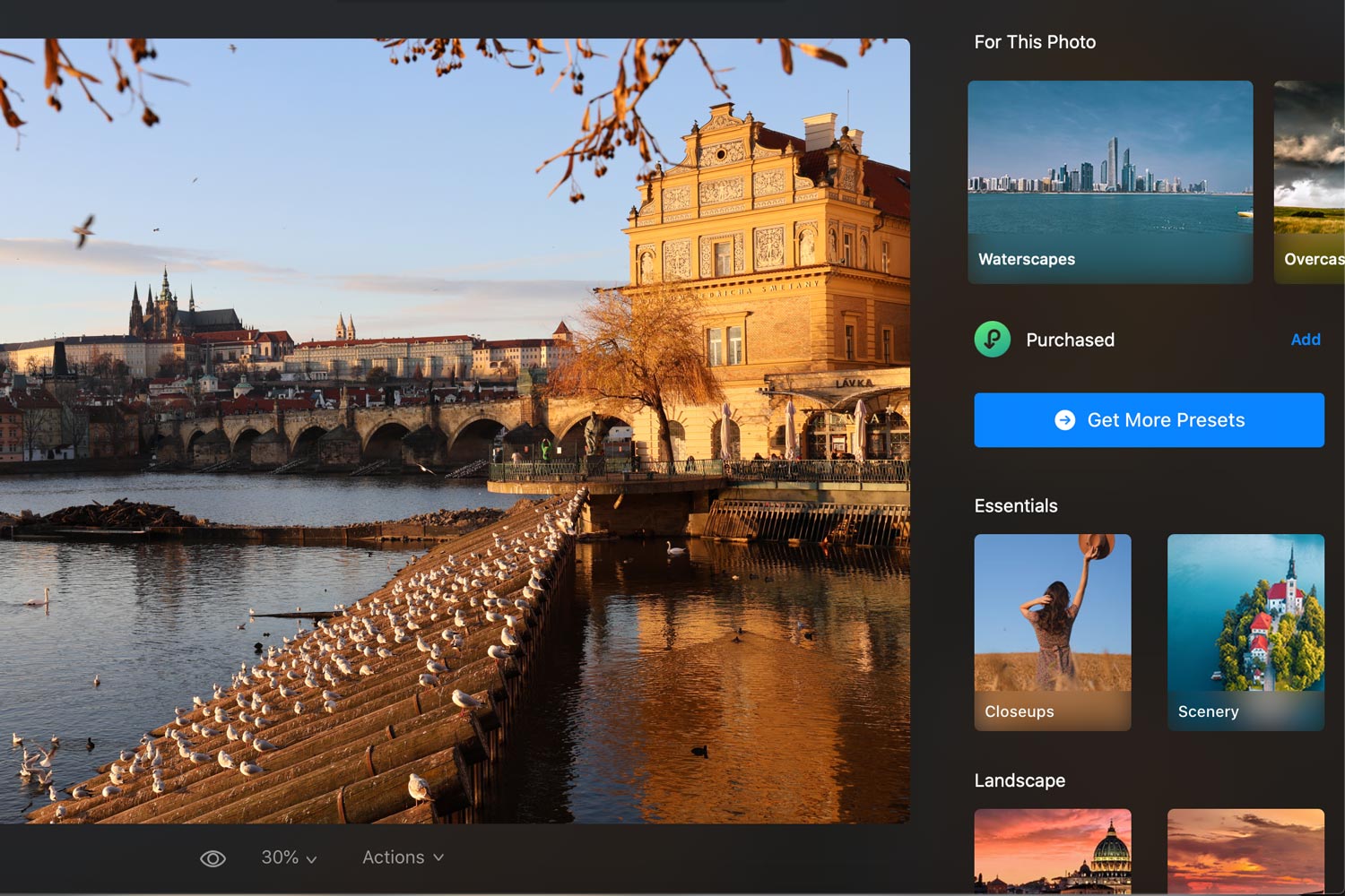 Presets (Presety) je sekce, v níž je možné fotky upravit pomocí presetů, tedy vlastně přednastavených filtrů. Já osobně presety nepoužívám, protože mi přijdou zbytečné – rád vše upravím přesně dle svého. Zároveň ale vím, že jde obecně o oblíbenou funkci, tedy to nechci nějak zásadně shazovat. Zajímavé je, že Luminar Neo je opravdu schopný poměrně přesně poznat, co na fotce je a podle toho k ní předvybrat příslušnou sekci presetů (na způsob město, noční město, krajiny, portrét…). Funguje to hezky, a komu tento svět vyhovuje, bude nejspíš spokojený.
