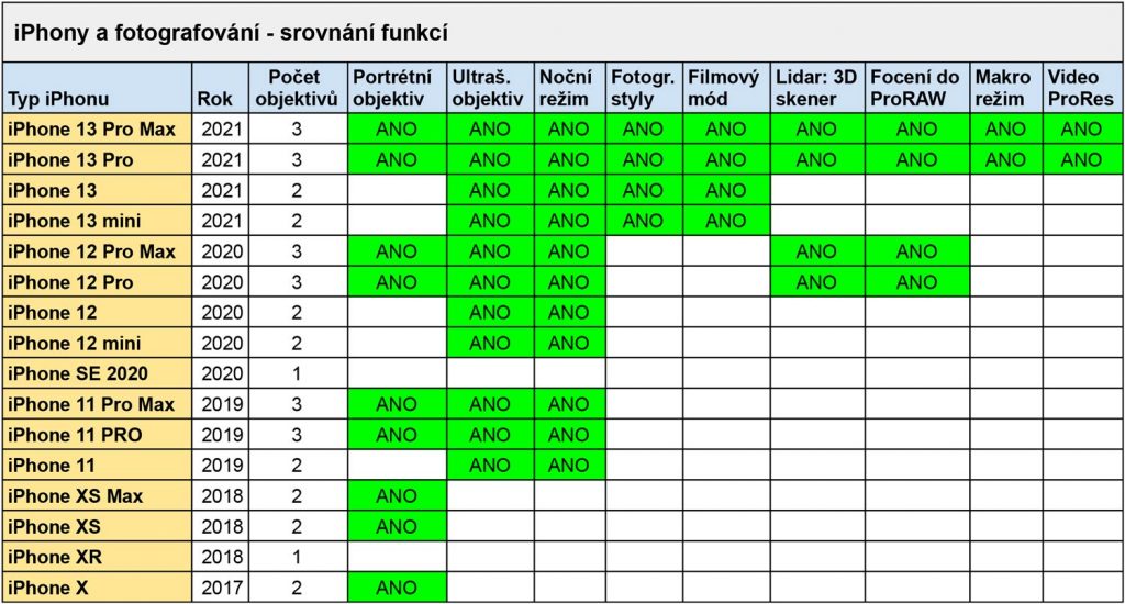 Přehled funkcí důležitých pro focení - sloupce je možné posouvat.| Typ iPhonu | Základní cena v Kč | Představen | Počet objektivů | Umí fotit portréty? | Portrétní objektiv | Ultraširokoúhlý obj. | Noční režim | Fotografické styly | Video - Filmový mód | Lidar | Focení do ProRAW | Makro režim | Video - Apple ProRes |