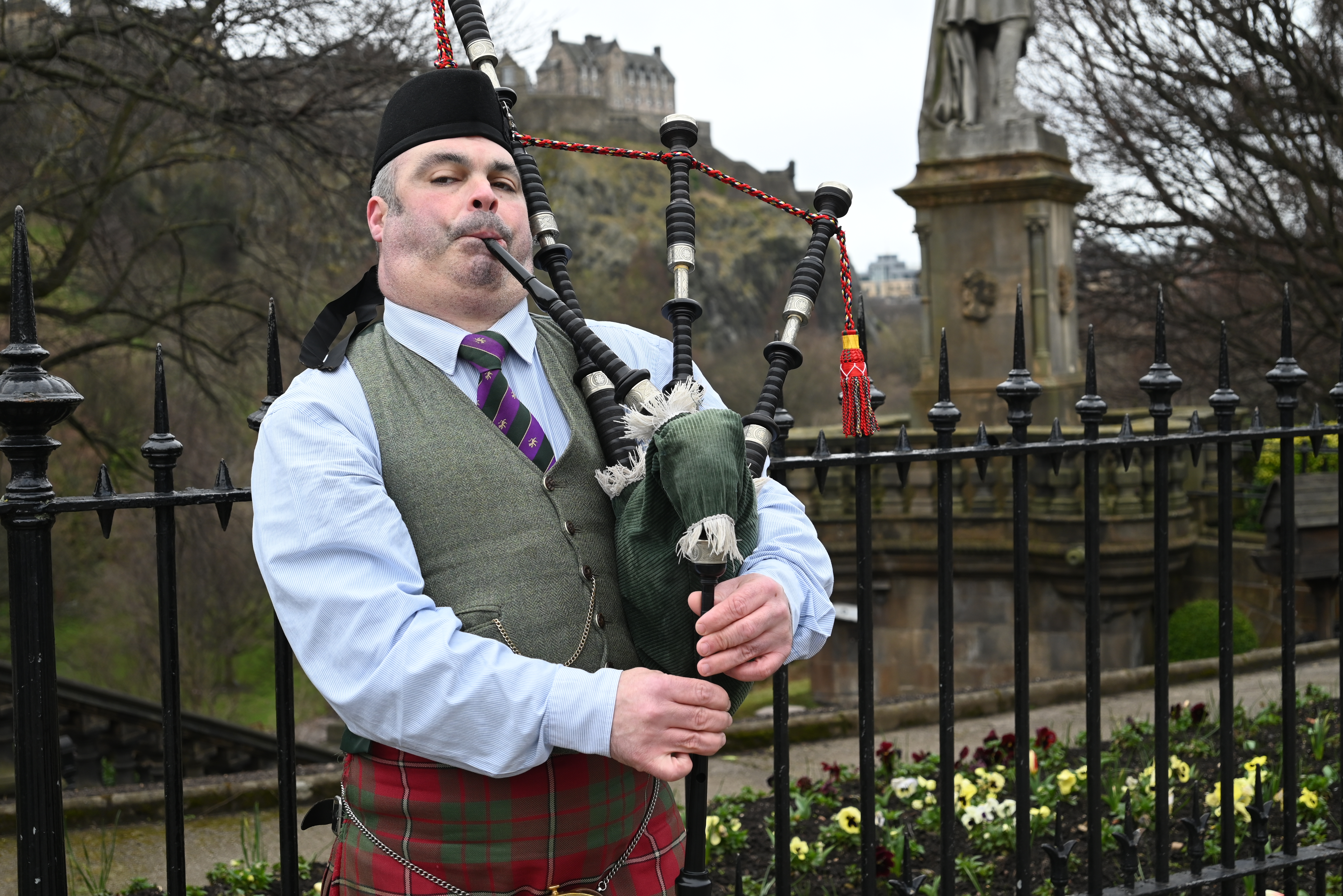 Tušil jsem, že chce fotku dudáka v sukni. Tu je, byť v trochu pršlavém skotském počasí. Neupravená fotka v plné velikosti.