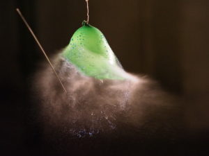 Ještě jednou vysvětlím, jak vznikaly ty pozoruhodné obrázky propíchnutých balónků: namáčknu spoušť a foťák neustále utváří měnící se sérii 14 obrázků… Když se okamžik přiblíží (a jehla letí), už jen domáčknu a série tedy obsahuje desítky obrázků (včetně těch 14 před zmáčknutím spouště). Z nichž už je obvykle snadné něco vybrat…