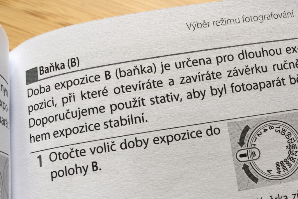 Pro zajímavost k bodu 1: „B“ = bulb = balónek od původně používané pneumatické „dálkové“ spouště. Gumový balónek s hadičkou (jako u klasického tlakoměru). Zmáčkneš, tím foukneš vzduch do prostoru závěrky v aparátu, a dokud držíš balónek zmáčknutý, tlak vzduchu drží závěrku otevřenou. Čas se doporučuje odpočítávat na řádných kapesních cibulích na ozdobném řetízku. Znalci mechanické fototechniky by jistě uměli doplnit tenhle letmý popis vědecky.