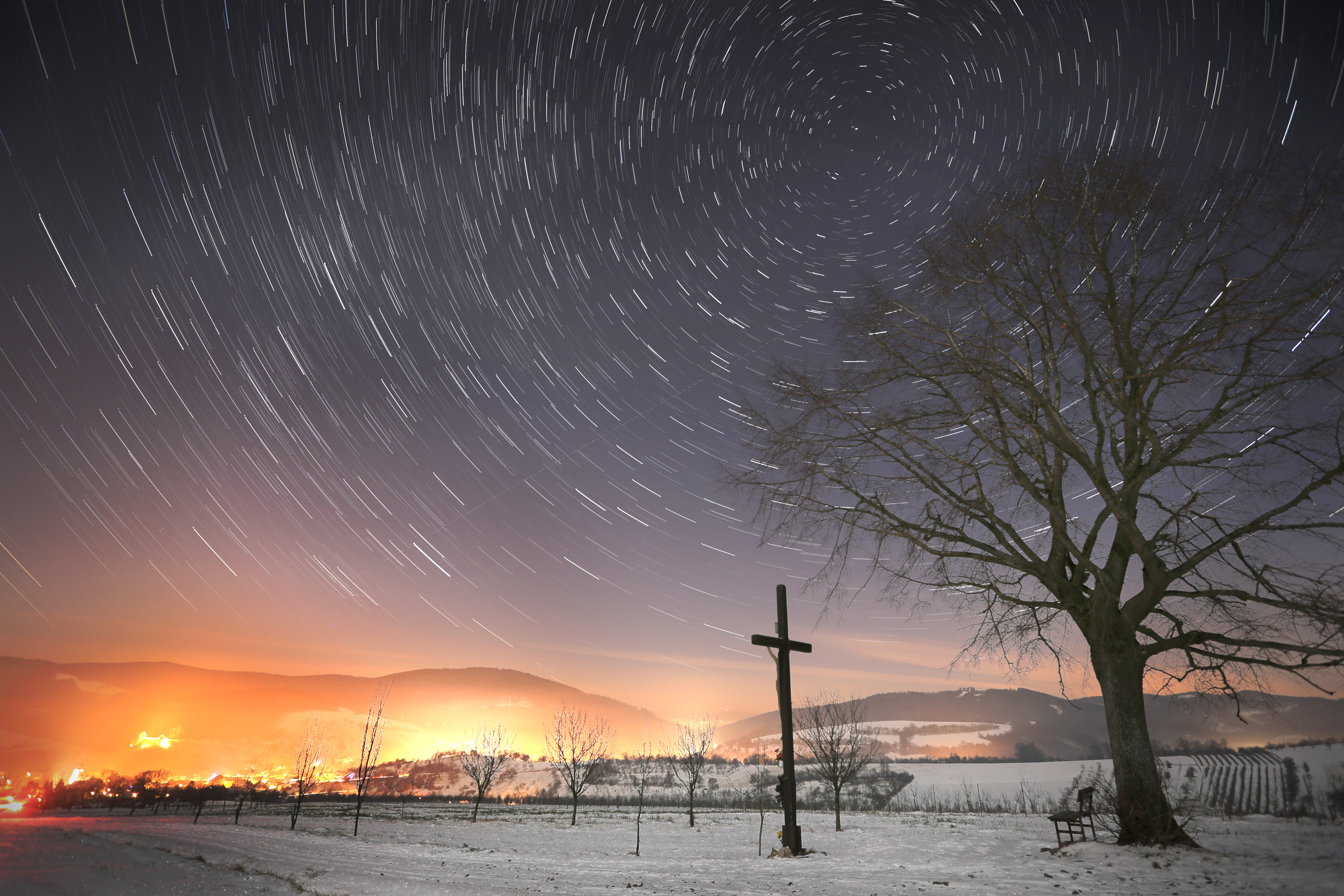 Pokud si nyní říkáte: “no to je vážně jednoduché”, máte naprosto pravdu. První pokusy vás nadchnou, viz výše, ale zároveň rychle odhalíte hlavní chyták: je totiž zoufale obtížné být v pravý čas na pravém místě. Samozřejmě, ne vždy jsou hvězdy hezky vidět, ale trocha trpělivosti stačí – mnohem větší problém je ovšem najít místo bez světelného smogu, zkrátka místo, kde do obrázku nebudou zasahovat nepřátelská světla. Ta ostatně vidíte i na snímku s křížem, který stojí na naprosté samotě asi kilometr od oné svící vesnice… Ona rušivá světla si vás totiž najdou vždy a všude. Tedy doporučuji se opravdu obrnit trpělivostí a když nastane dokonalá noc, vyrazit někam daleko od civilizace, do opravdové tmy…