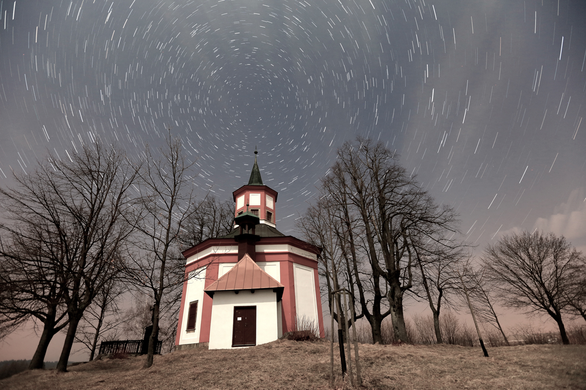 Pohyb hvězd v časovém úseku kolem 14 minut nad barokní kaplí v Hartmanicích na Vysočině (smontováno z cca 28 dílčích záběrů po 30 vteřinách. Fotografie v plném rozlišení je zde.