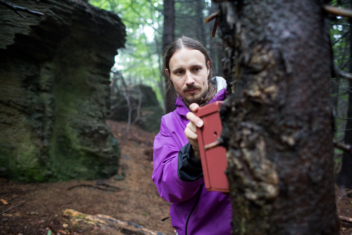 A těsně před onou skálou jsou na stromě přidělané dvě fotopasti zachycující vzácné okamžiky ze života těchto plachých šelem. “Sami bychom na tohle krásné místo nikdy nepřišli, zavedli nás sem rysové, které jsme jednu zimu stopovali,” říká mi Miroslav Kutal, který se monitorováním šelem v Beskydech zabývá mnoho let a patří k nejrespektovanějším odborníkům v ČR. “Už jsme tu nebyli asi měsíc, tak se podíváme, co fotopasti vyfotily,” dodává a začíná odmontovávat kryty obou kamer.