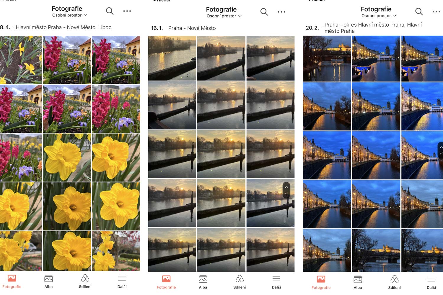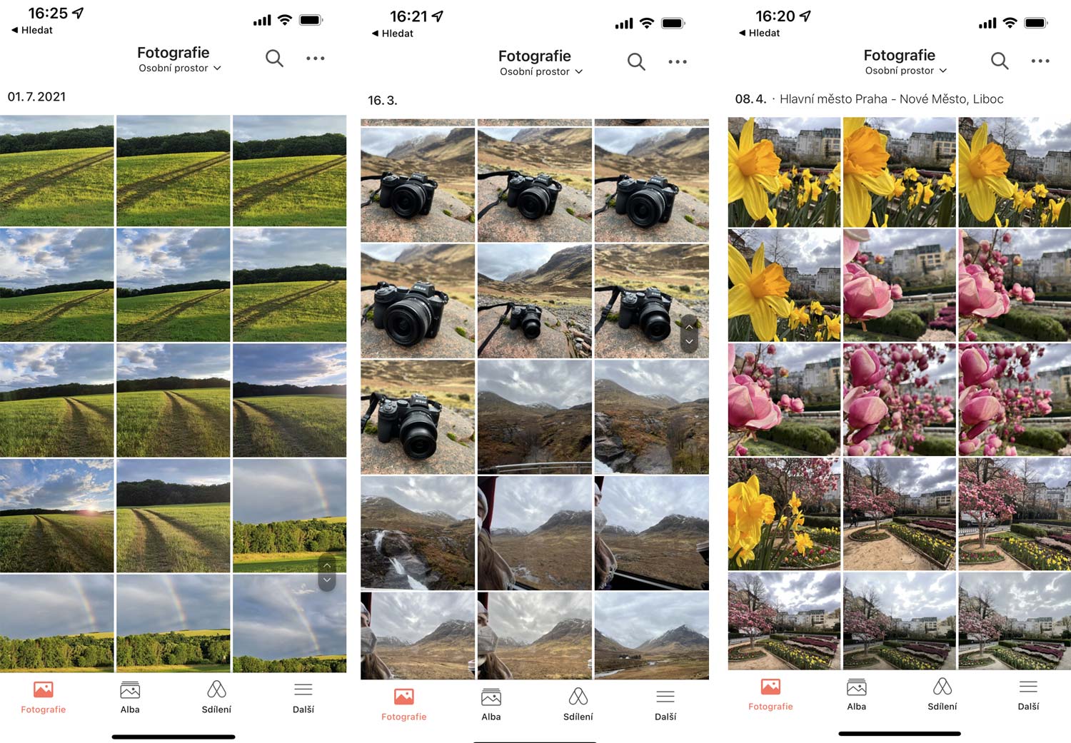 Obrazovka Fotografie je logicky základní defaultní volbou a její funkce je zjevná na první pohled: právě zde uvidíme kompletní přehled všech fotek, které máme v systému uložené. Co je možné snadno přehlédnout (zejména “začínajícím” uživatelem), je opět ona skvělá možnost přepnout se z časové osy do zobrazení adresářů – dělá se to přes tři tečky v pravém horním rohu, kde je volba “Přepnout do zobrazení složky”.