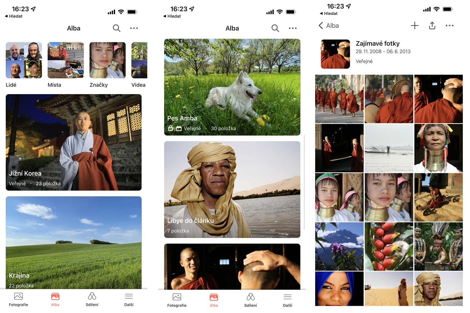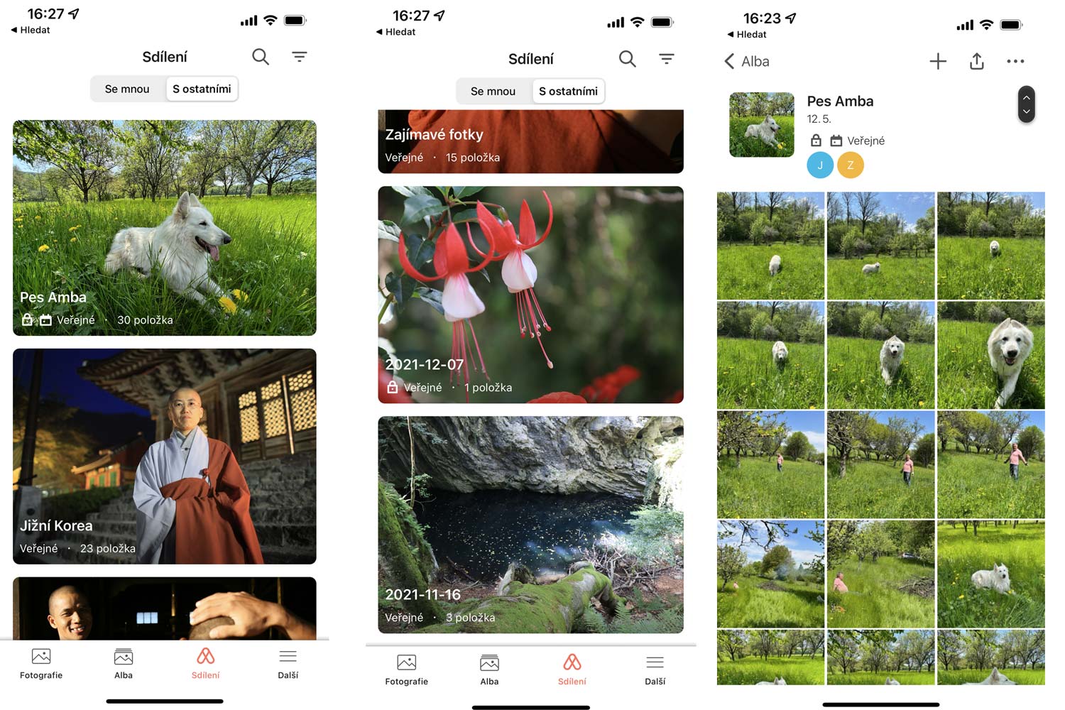Třetí obrazovkou je Sdílení, které žádný složitější komentář nevyžaduje – je to prostě velmi šikovný přehled alb, která sdílíme. Přímo v základním zobrazení je přitom vidět, zda je album sdíleno s konkrétními uživateli, nebo přes veřejný odkaz.