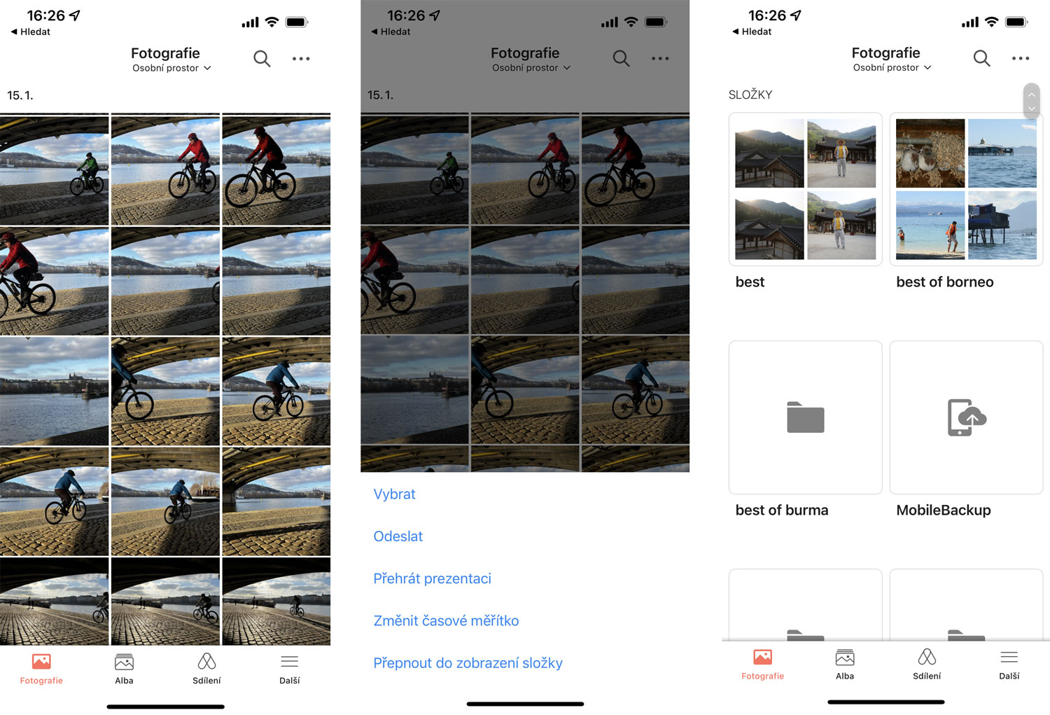 Podobně jako desktopová aplikace, i na mobilu najdeme tři základní sekce. Fotografie, Alba, Sdílení.