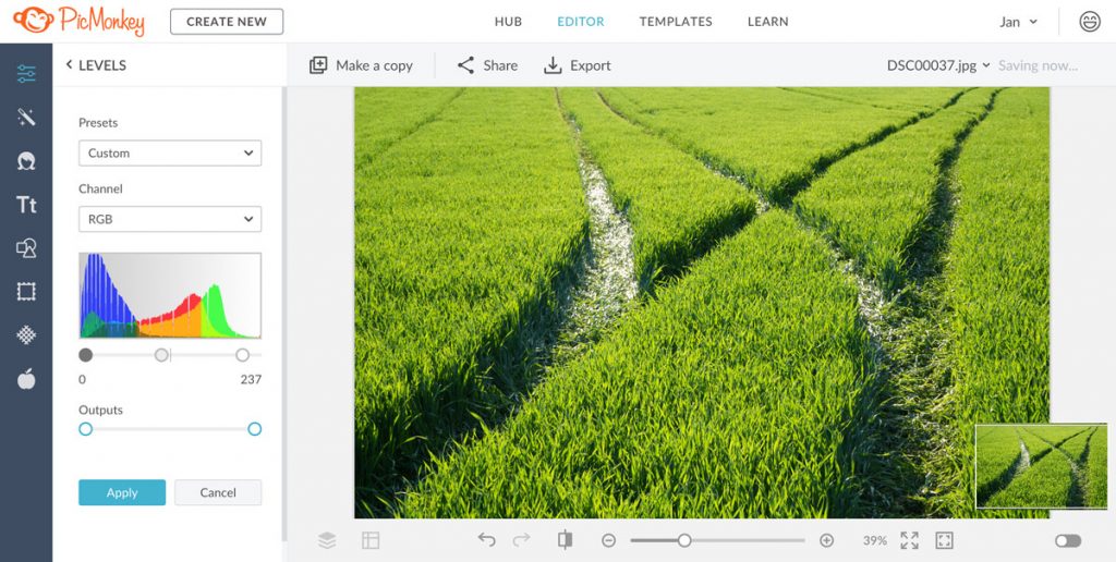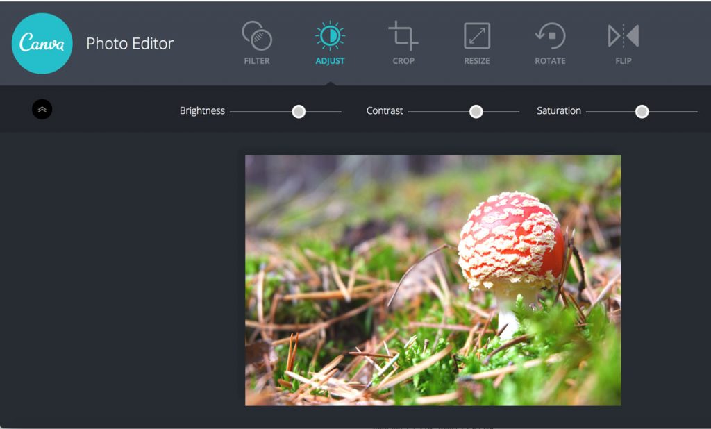 Canva nyní nabízí přímo i editor na úpravy fotek, je to nesporně nejjednodušší editor na této stránce – nabízí pár (vcelku hezkých) filtrů a opravdu základní úpravy.